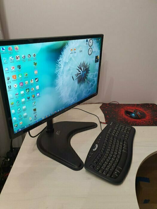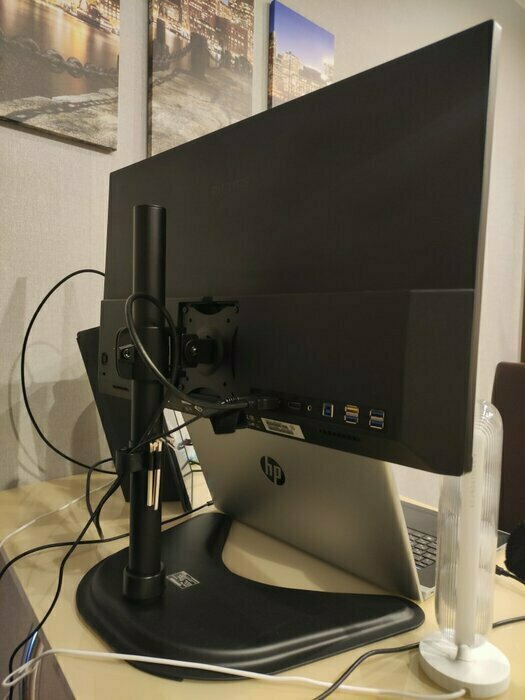Собирается легко, стоит крепко, куча степеней свободы регулировки положения экрана.