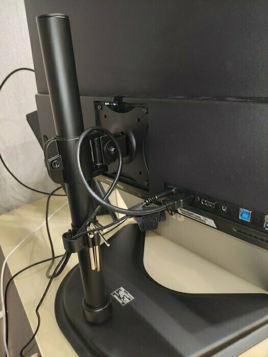 Наклейка с характеристиками и наименованием на видном месте, лучше бы ей на vesa квадрате быть и не отсвечивать. Но не настолько мозолит глаза чтобы удалять, или переклеивать.