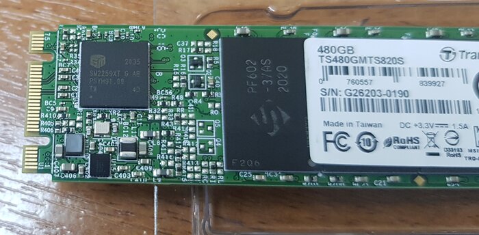 Контроллер SM2259XT. Который судя по всему является урезанной версией (без DRAM буфера) полноценного SM2259. Дата производства накопителя 12.2020. Несмотря на то, что я находил в Интернете фотки этой SSD’шки с контроллером SM2258. Но там даже расположение элементов и количество чипов NAND другое. Судя по всему Transcend не гнушается выпускать под одним артикулом совершенно разные изделия с разными характеристиками. Это на самом деле просто свинство. И это был последний накопитель этой фирмы который я купил. Да, контроллер конечно же стыдливо заклеен бумажкой (на фото я её уже переклеил). А на фотках из инета (на экземпляре с нормальным контроллером) бумажка наклеена на чипах NAND. Вот и делайте выводы.