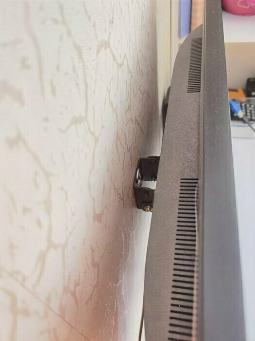 Монтаж крепления придумал не далёкий человек. Что бы было понятно поясню. Кронштейн состоит из двух частей, одна крепится к телевизору, вторая к стене. Друг к другу части в последствии крепятся на навесы и угол наклона фиксируется двумя болтами по бокам. Теперь самое главное! После установки крепления на стену вы надеваете на него телевизор со вторым креплением, НО! что бы зафиксировать угол наклона вам каким-то образом надо подлезть за телевизор (который в 3 см от стены) и стянуть болты!!!! ААААА дебiлы. Вам нужна отвертка полметровая и ловкость рук. А если (как у меня) телевизор с одной стороны прислонен к шкафу, то с этой стороны вы никогда не закрепите болт на креплении.