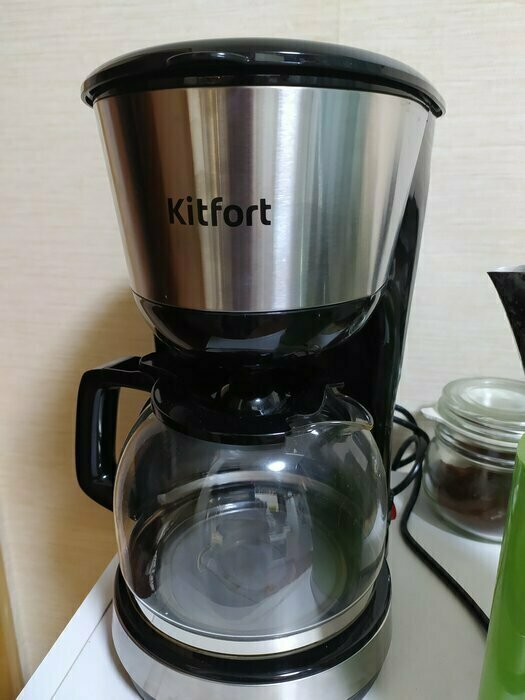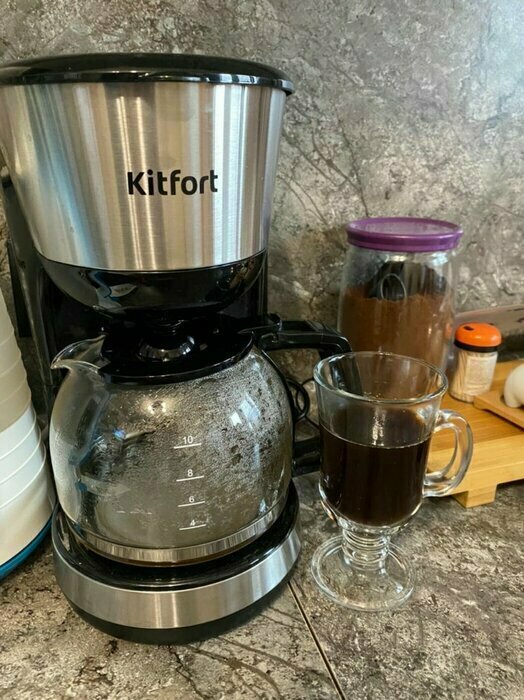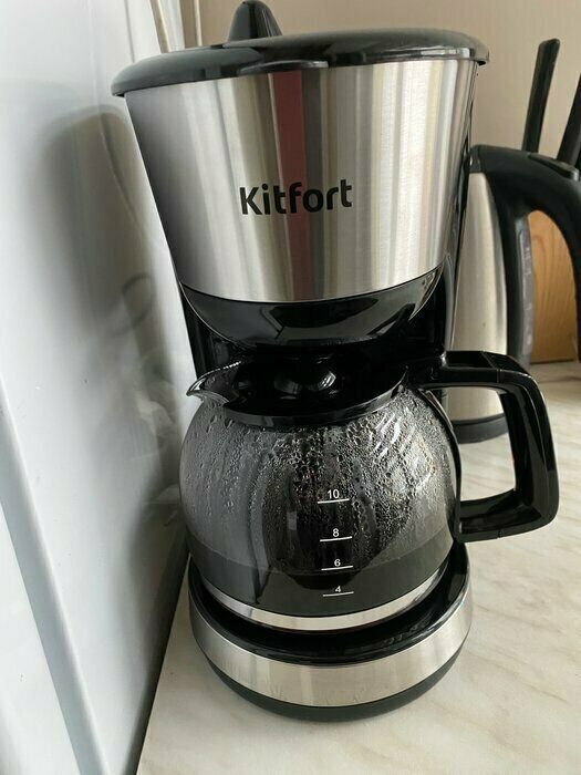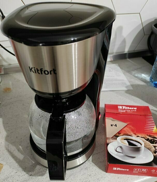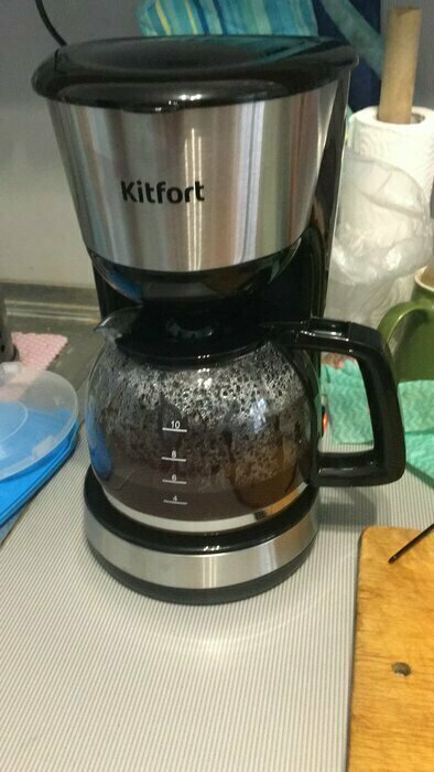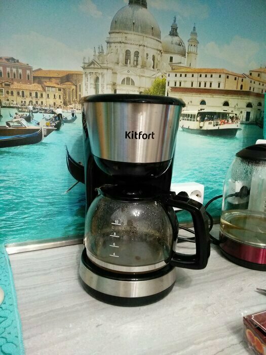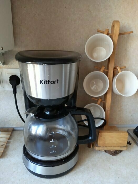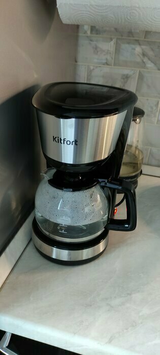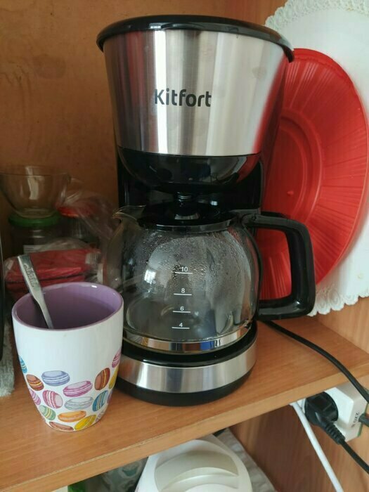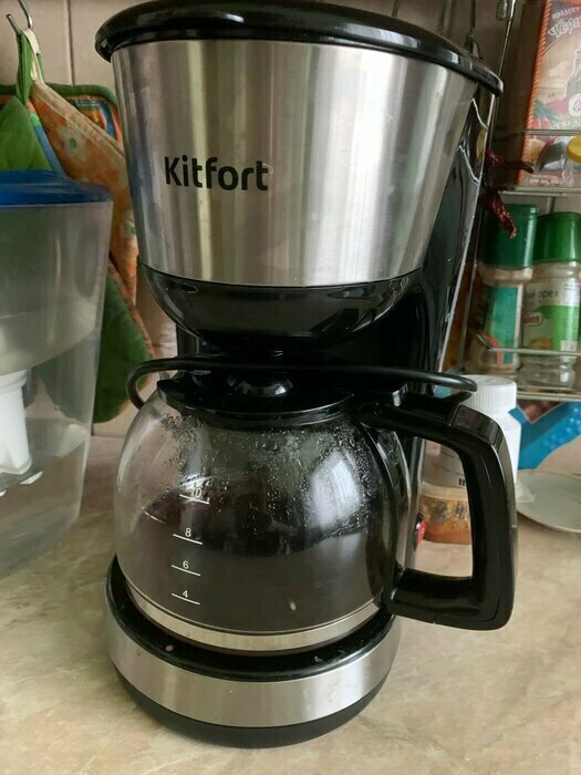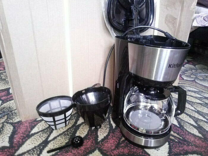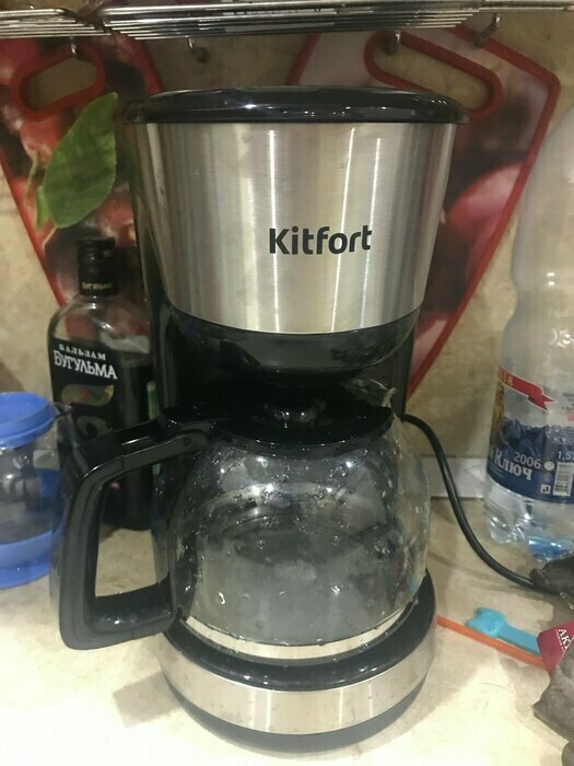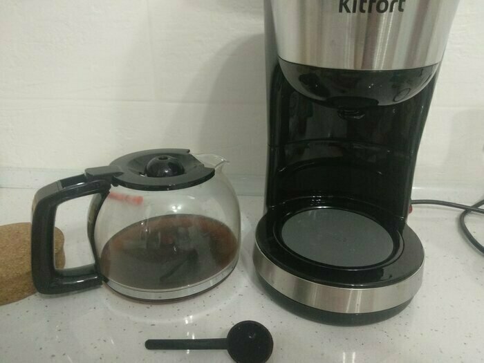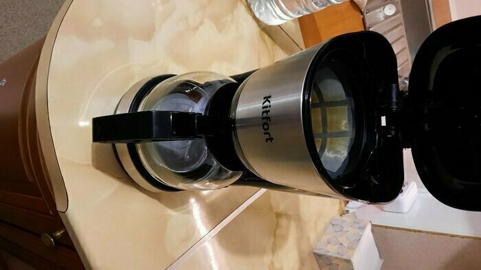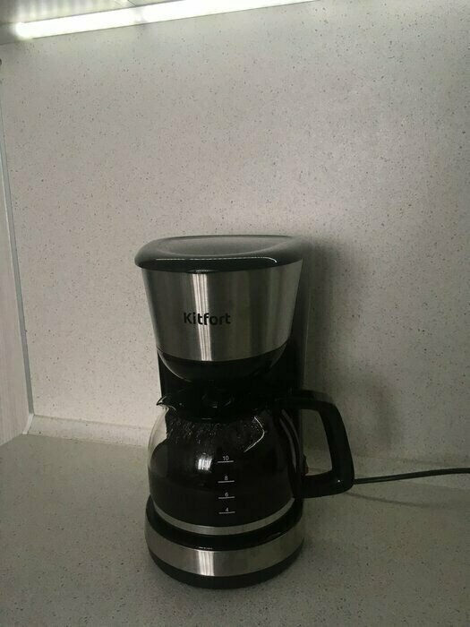 Купили сегодня кофеварку китфорт. Сварила кофе за 5 минут. В принципе со своей функцией справляется хорошо. Оптимальный объем кувшина, многоразовый фильтр. Посмотрим как будет работать в дальнейшем. Пока претензий нет.