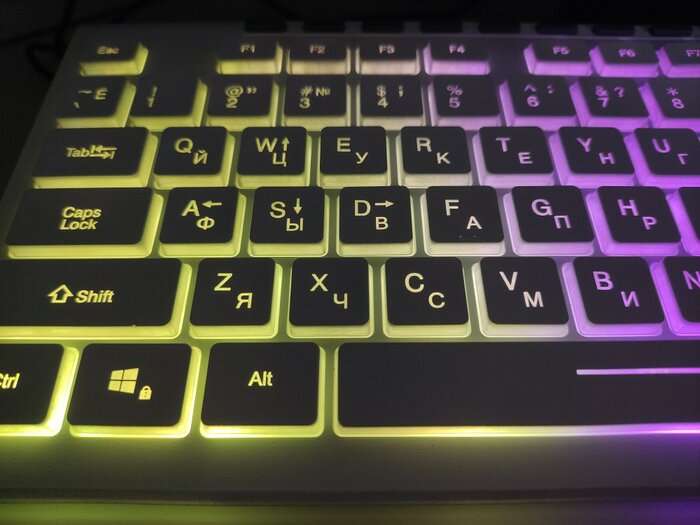 За 5 месяцев произошло следующее: поскольку брал для работы, почти стерлась в 0 краска на центральных кнопках, а с ней и "пропали" буквы. Форма самих кнопок иногда вынуждает случайно "цепляться за их края, когда быстро печатаешь, нужно выше пальцы поднимать. Клавиатура стоит на коврике, по которому скользит, потому что резиновые упоры маленькие и не удерживают ее на коврике. Варианта подсветки всего 3, все градиентные, моноцвета нет.