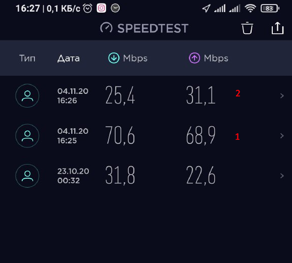 Купил устройство с целью усилить сигнал в дальней комнате. В итоге между роутером и репитером прямая видимость и индикатор горит синий, между WiFi-приемником и репитером тоже прямая видимость и скорость сетевого соединения отображается 173 Мбит (в свойствах подключения ОС). Теперь делаем тестовые замеры скорости с репитером (1) и без него (2). 1. 41 Мбит / 21 Мбит 2. 66 Мбит / 46 Мбит Ну и для проверки решил также проверить телефоном с сетью роутера и с сетью репитера - результат такой же, отображен на скриншоте с телефона и помечен красными цифрами (1 - без репитера, 2 - с репитером) Собственно на выходе я имею не усилитель а замедлитель скорости Wifi. Кстати роутер тоже вашей фирмы Tenda AC10.