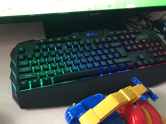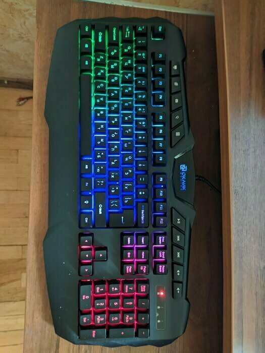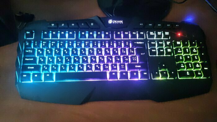Узкие клавиши с невнятным позиционированием указательных пальцев на "А" и "О". Увеличенный ход клавиш в стиле игровых клавиатур. Слабая подсветка - на все поле 3 светодиода, по факту - всего 3 уровня яркости и 3 типа радужной подсветки. Сильно яркие светодиоды Num+Caps+Scroll. На свету надписи на клавишах невнятные хоть с подсветкой, хоть без.
