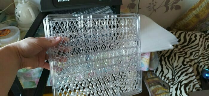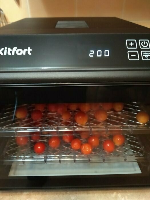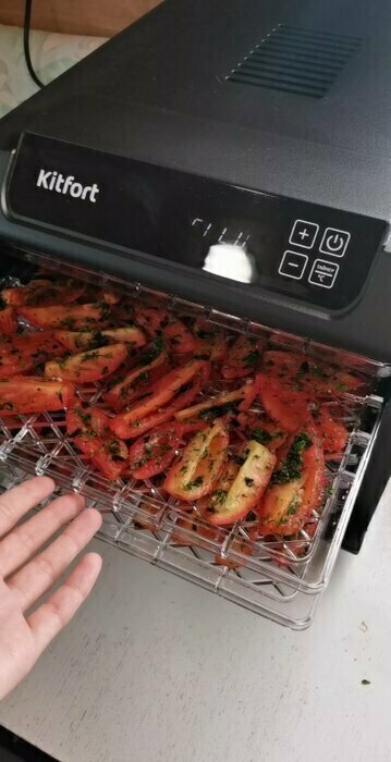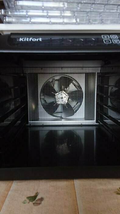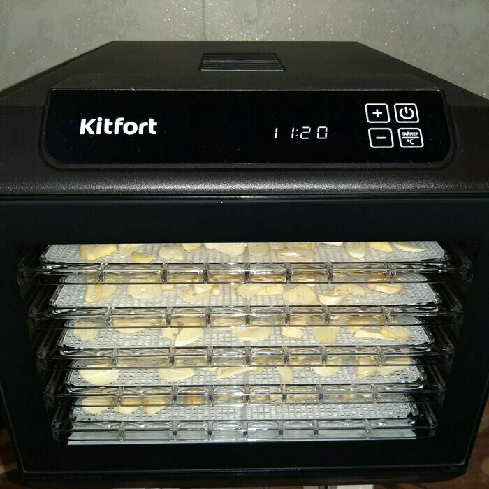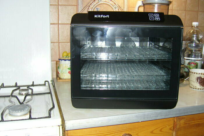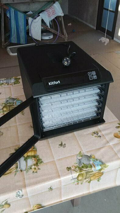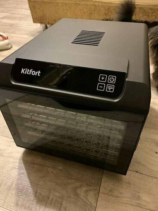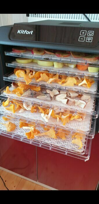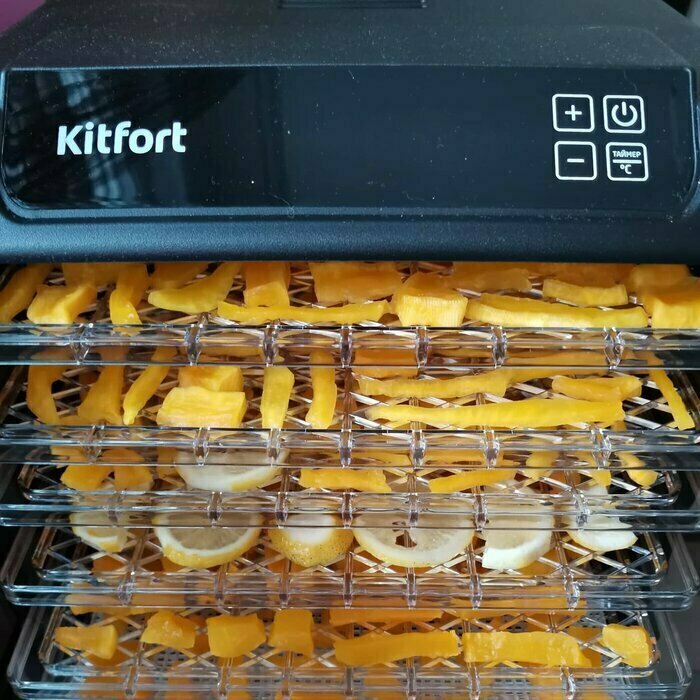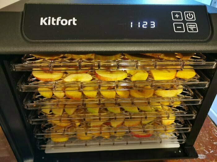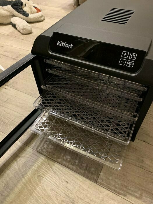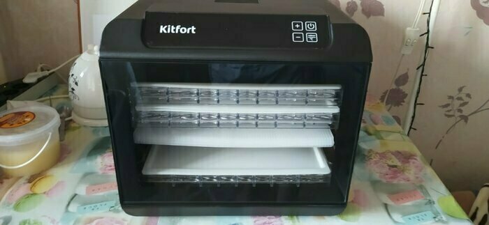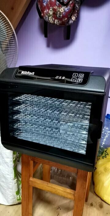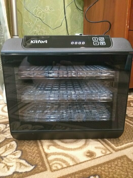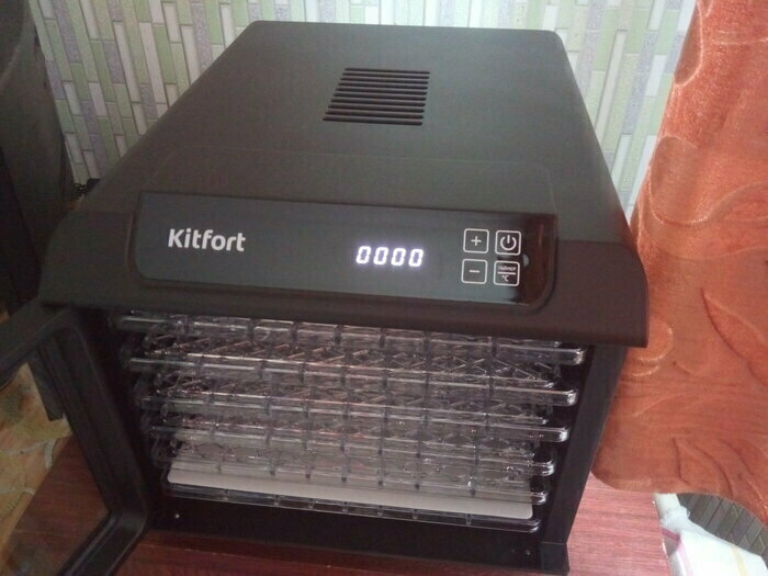 Получила в подарок от мужа сушилку Kitfort kt-1905. Из плюсов: 12 сеток (6 крупных, 6 мелких), 6 поддонов в комплекте. Вентилятор сзади, что позволяет равномерно просушивать продукты, не смешивать запахи. Удобное, простое управление. Есть возможность устанавливать время и температуру обдува. Поддоны легко ставить и снимать.