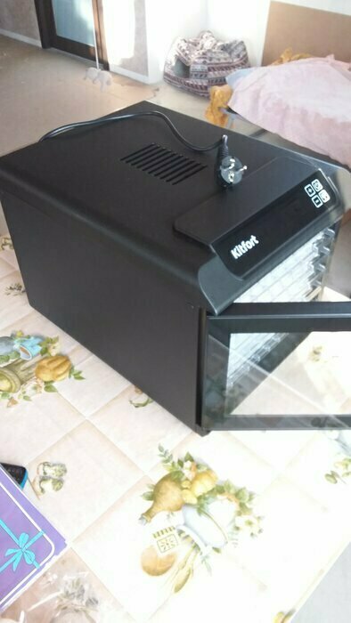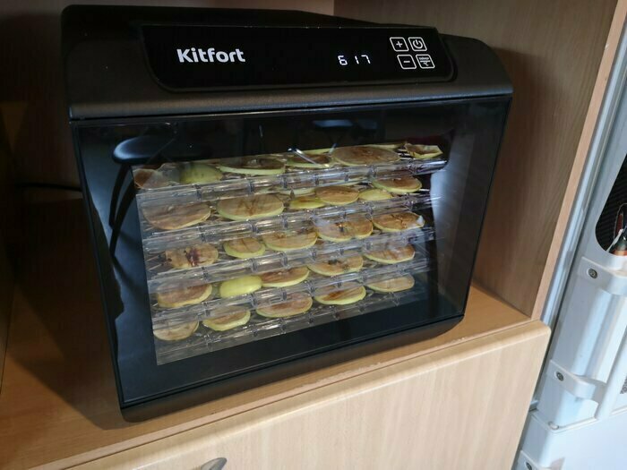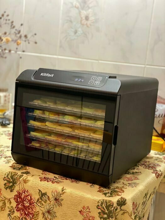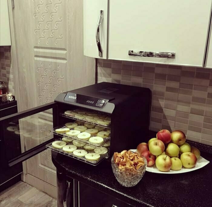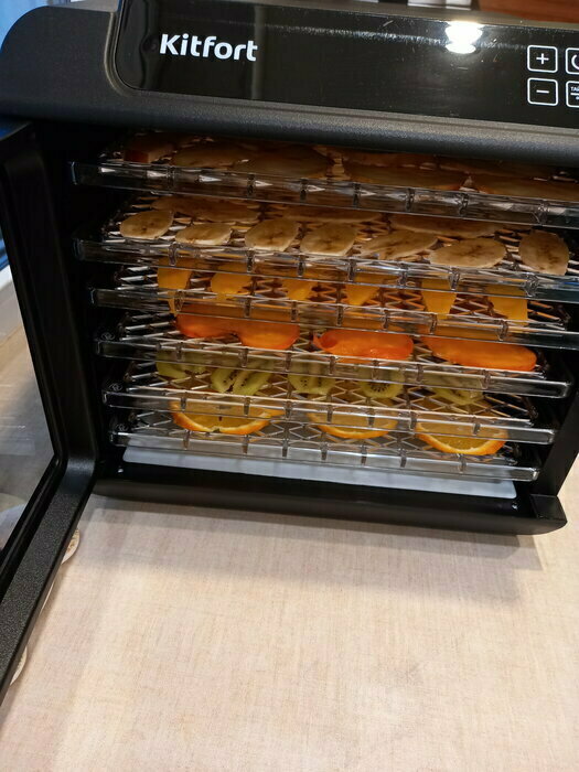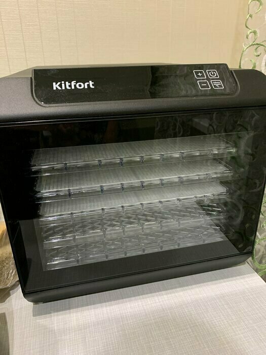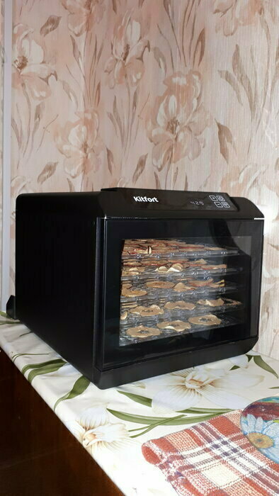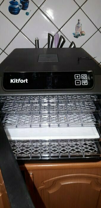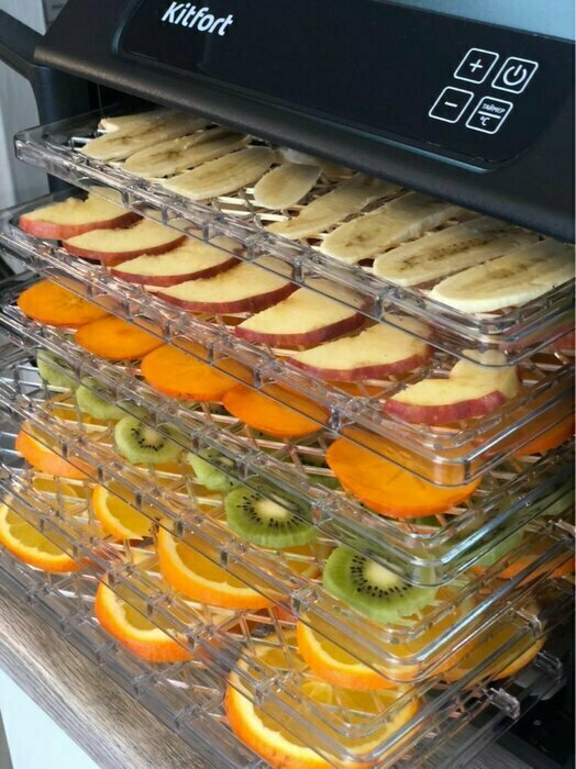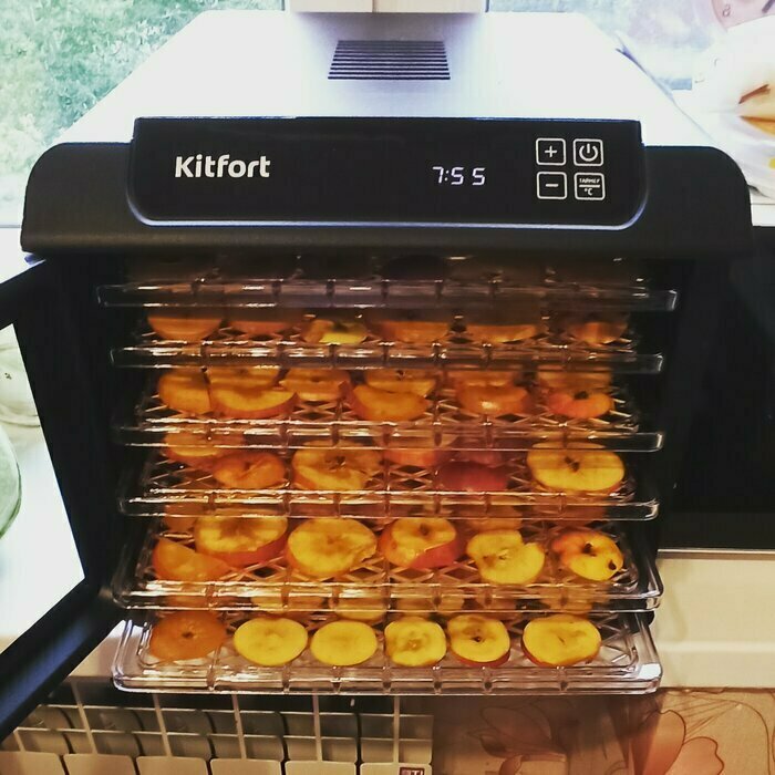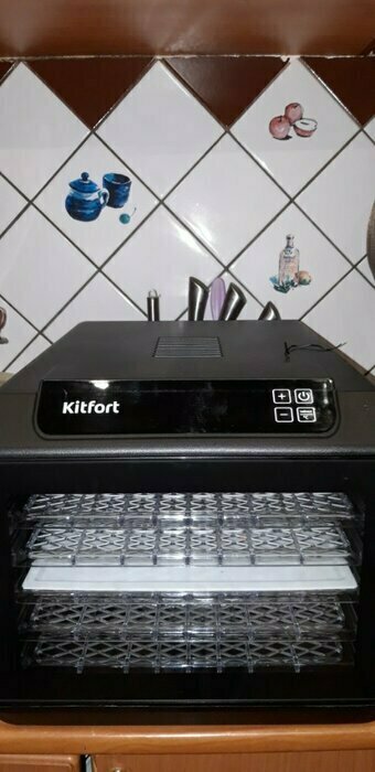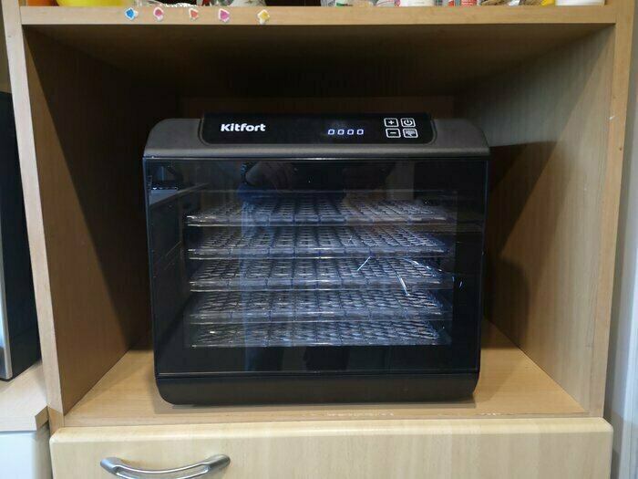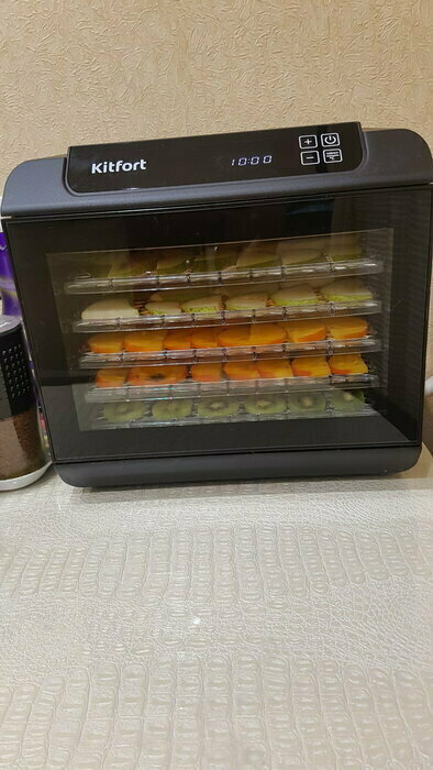 Купила, грубо говоря с закрытыми глазами, никогда не пользовалась такими вещами, вдруг мне очень захотелось попробовать что-то новое. Смотря разные сушилки и обзоры в интеренете, так ничего достойного я не нашла, но уже точно была уверена, что мне нужно горизонтальная сушилка! И вот я ее нашла - kitfort-1905. Мне понравился ее дизайн, цвет который очень хорошо сочетается с любой кухней и конечно на габариты. При заборе я несла ее сама со второго этажа и она достаточно легкая! Когда я ее привезла домой, я влюбилась в неё ещё больше!!! Все так аккуратно запаковано и сложено. Конечно я сразу помыла ее и заложила нарезанные фрукты (бананы, киви, апельсины и яблоки) разом на ночь. Запах был просто невероятный, очень вкусно 🤤 Утром я уже наслаждалась сухофруктами. Яблочки даже не потемнели! И да, в подарок идёт магнитик, очень миленький. Теперь мы с мужем смотрим всю технику от этой фирмы.