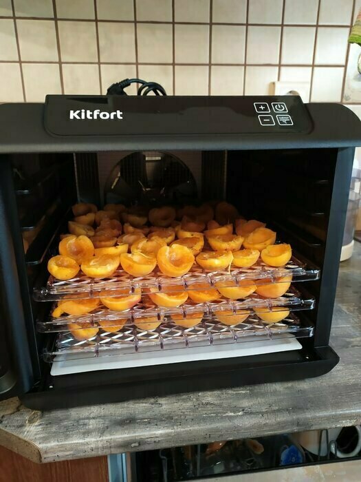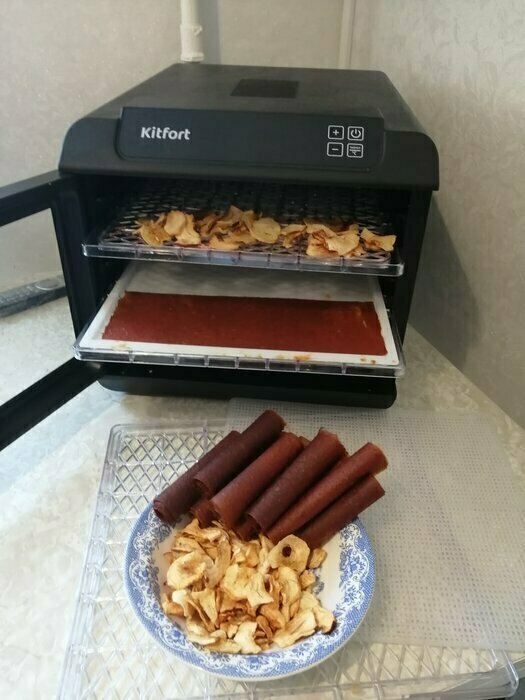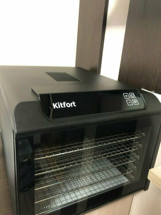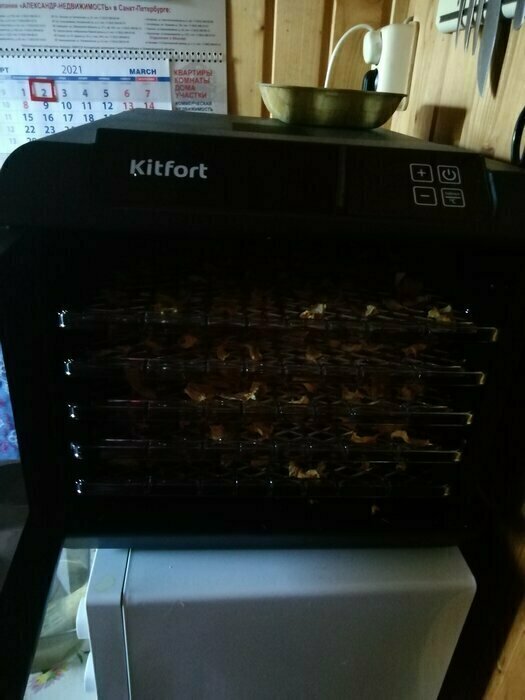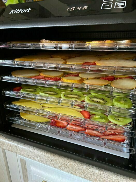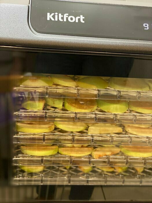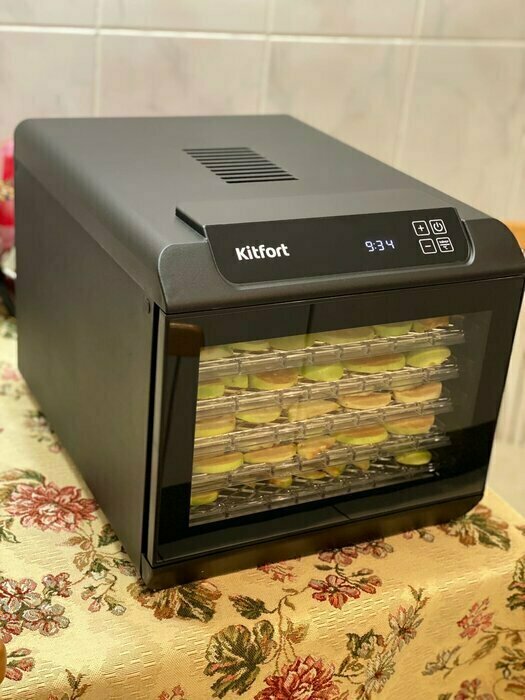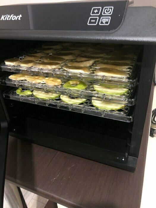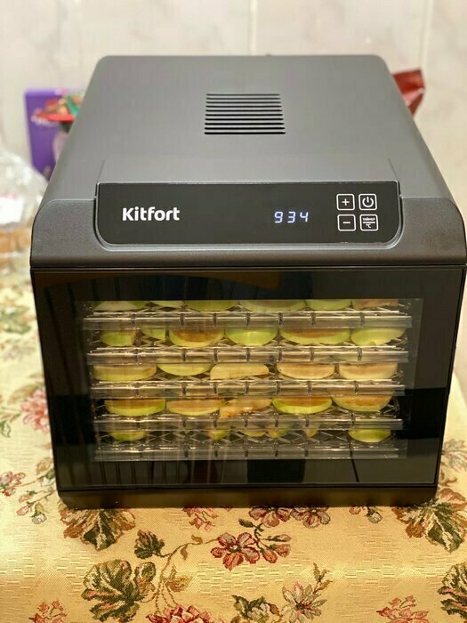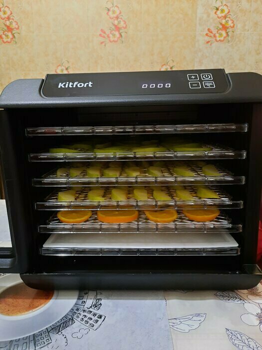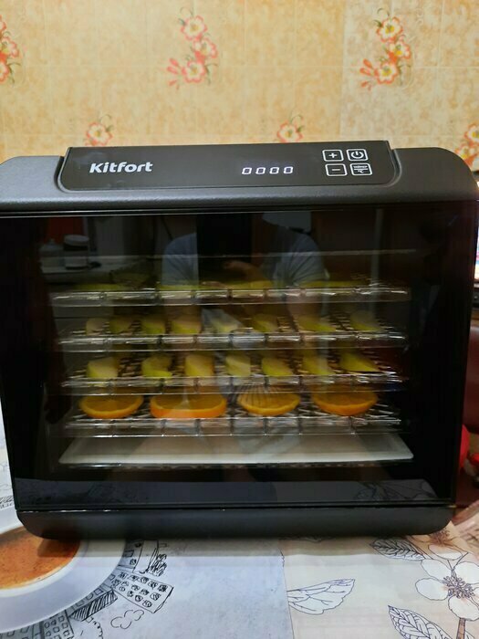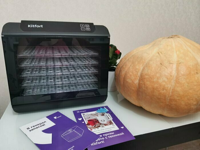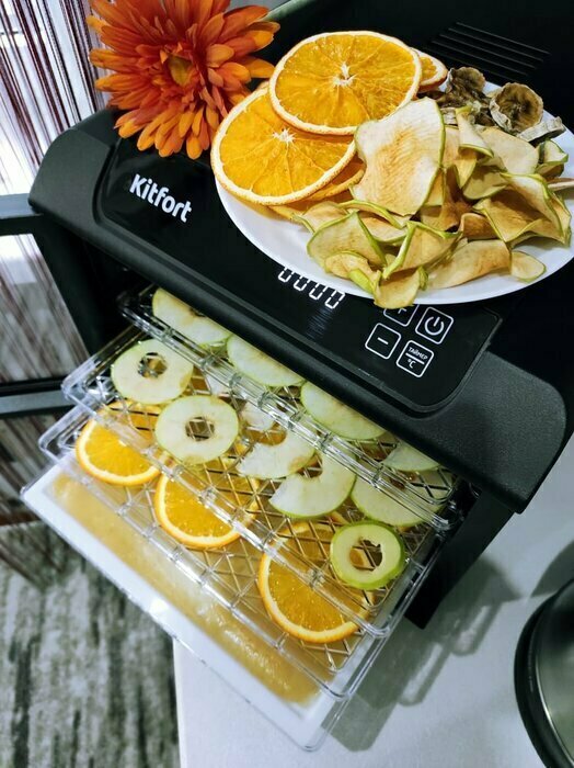 Купила, грубо говоря с закрытыми глазами, никогда не пользовалась такими вещами, вдруг мне очень захотелось попробовать что-то новое. Смотря разные сушилки и обзоры в интеренете, так ничего достойного я не нашла, но уже точно была уверена, что мне нужно горизонтальная сушилка! И вот я ее нашла - kitfort-1905. Мне понравился ее дизайн, цвет который очень хорошо сочетается с любой кухней и конечно на габариты. При заборе я несла ее сама со второго этажа и она достаточно легкая! Когда я ее привезла домой, я влюбилась в неё ещё больше!!! Все так аккуратно запаковано и сложено. Конечно я сразу помыла ее и заложила нарезанные фрукты (бананы, киви, апельсины и яблоки) разом на ночь. Запах был просто невероятный, очень вкусно 🤤 Утром я уже наслаждалась сухофруктами. Яблочки даже не потемнели! И да, в подарок идёт магнитик, очень миленький. Теперь мы с мужем смотрим всю технику от этой фирмы.