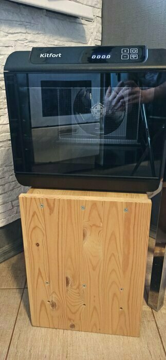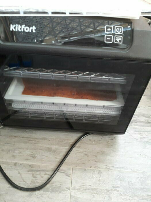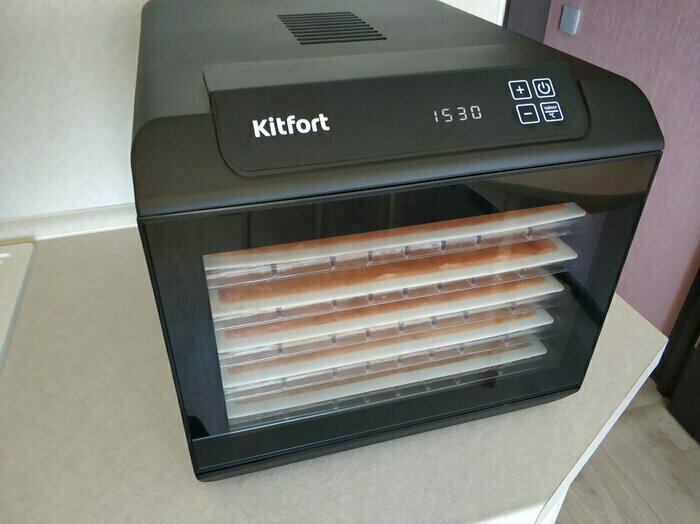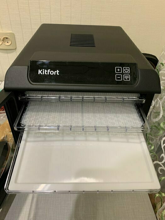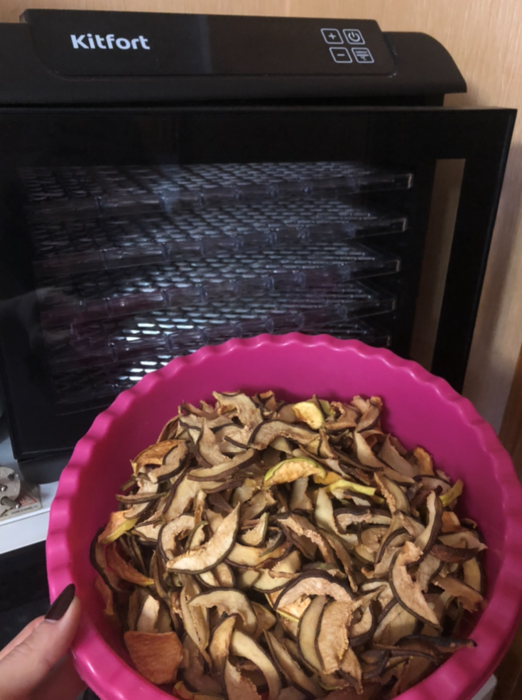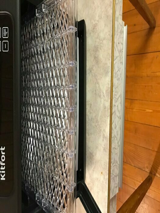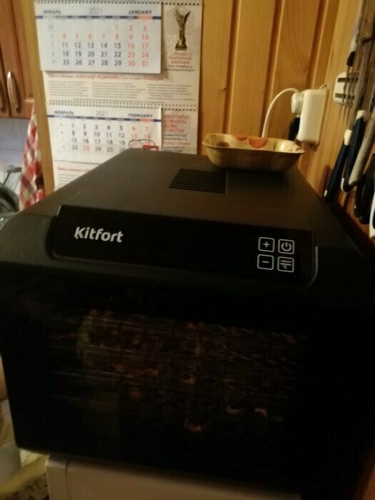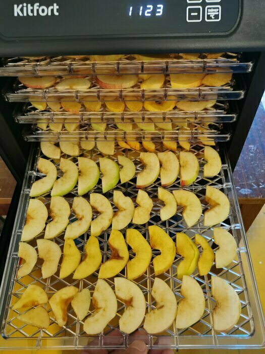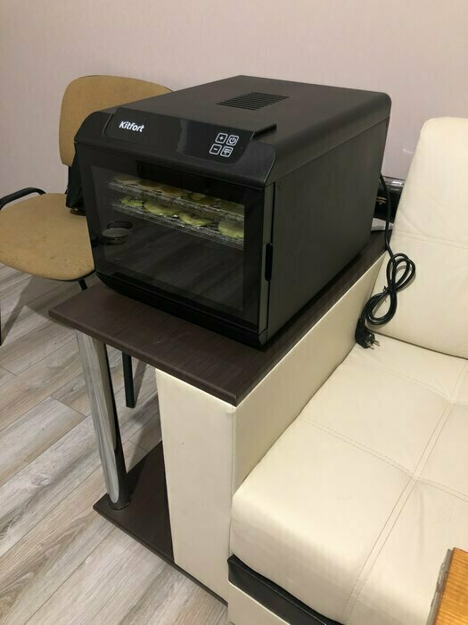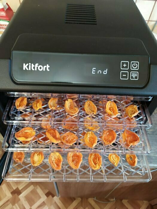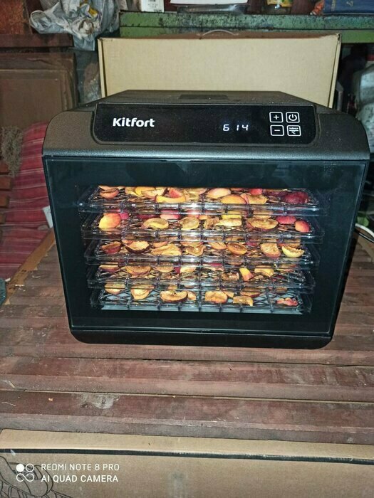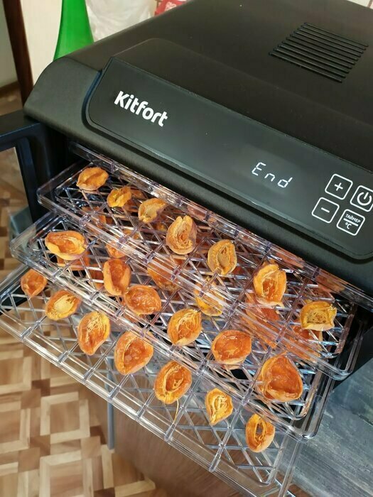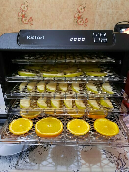 Купила, грубо говоря с закрытыми глазами, никогда не пользовалась такими вещами, вдруг мне очень захотелось попробовать что-то новое. Смотря разные сушилки и обзоры в интеренете, так ничего достойного я не нашла, но уже точно была уверена, что мне нужно горизонтальная сушилка! И вот я ее нашла - kitfort-1905. Мне понравился ее дизайн, цвет который очень хорошо сочетается с любой кухней и конечно на габариты. При заборе я несла ее сама со второго этажа и она достаточно легкая! Когда я ее привезла домой, я влюбилась в неё ещё больше!!! Все так аккуратно запаковано и сложено. Конечно я сразу помыла ее и заложила нарезанные фрукты (бананы, киви, апельсины и яблоки) разом на ночь. Запах был просто невероятный, очень вкусно 🤤 Утром я уже наслаждалась сухофруктами. Яблочки даже не потемнели! И да, в подарок идёт магнитик, очень миленький. Теперь мы с мужем смотрим всю технику от этой фирмы.