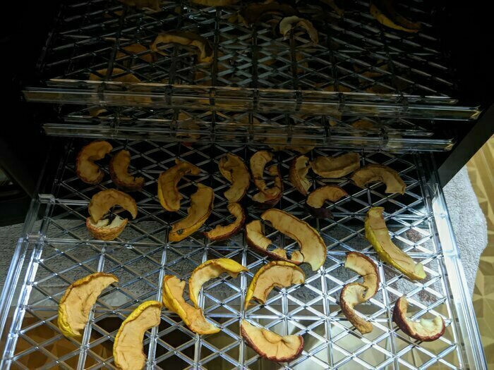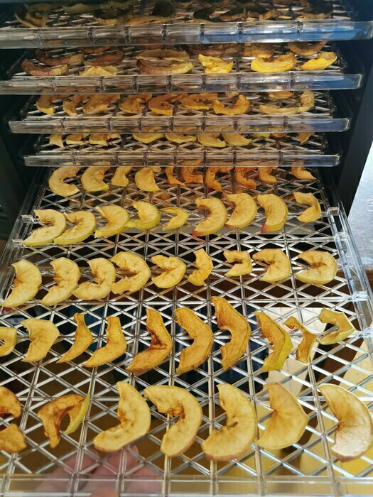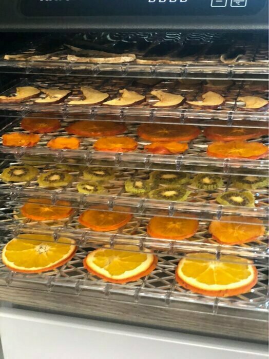 Самое частое, что мы сушили: яблочные чипсы и курица, пастила, апельсины, лимоны, рыба. Могу сказать, что с момента покупки сушилка практически не простаивала. Работает негромко. Если ночью включить, с соседней комнаты не слышно. Несмотря на то, что подача воздуха происходит равномерно для всех лотков, нижний уровень просыхает быстрее. Всё равно лотки приходится менять местами и переворачивать. Мне нравится!
