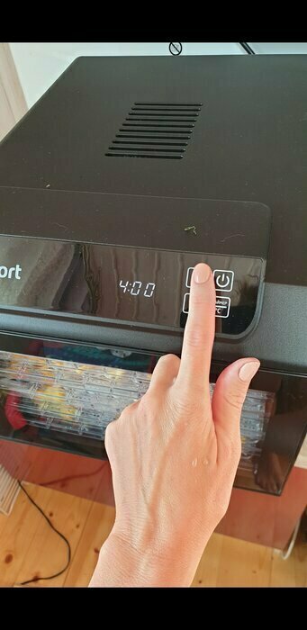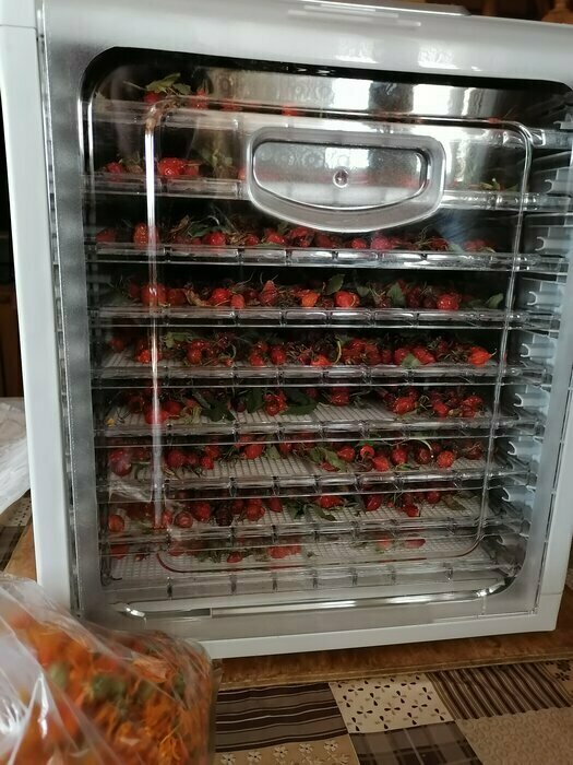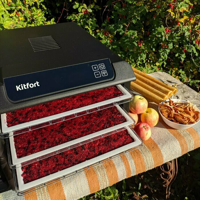Сушилка очень понравилась. Из плюсов хочется отметить: Она тихая, это очень важно для сушилки которой пользуются в квартире. Ведь фрукты и овощи сушатся в среднем 8-10 часов, а иногда и больше. Нередко приходится оставлять её на ночь. Она лёгкая, перемещать её не составит никакого труда. Сушилка боковая с горизонтальным обдувом, это несомненно плюс. Хорошие пластиковые поддоны, легко моются и практически ничего не прилипает. В комплекте идут поддоны как с крупной сеткой так и с мелкой для ягод, а также поддоны для пастилы (которые к слову можно положить вниз чтобы сок не стекал прямо на дно сушилки). Лёгкий интерфейс, разобраться как она работает дело 5 минут. У сушилки хорошая система вентиляции, запахи когда сушатся фрукты стоят чудесные) Чуть не забыл, дизайн у неё очень стильный.