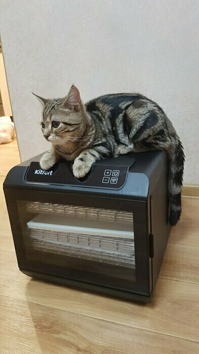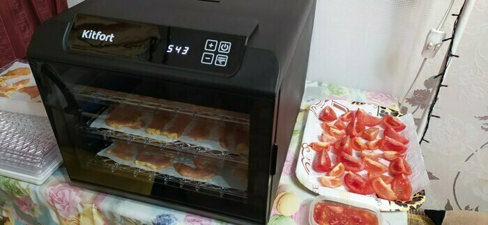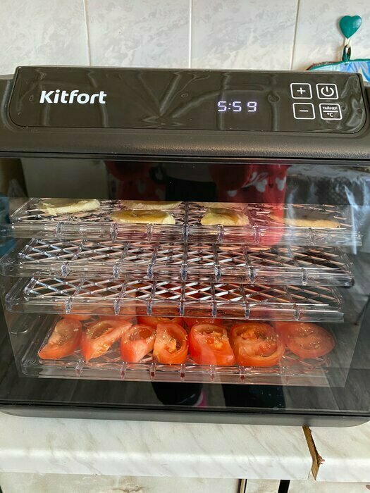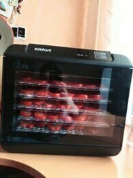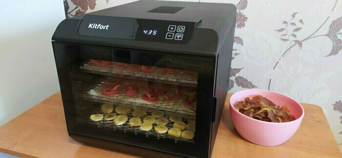 Я стала счастливой обладательницей сушилки для овощей КТ-1905, сказать что я счастлива это ничего не сказать! Очень стильная, компактная, безшумная, ставлю на ночь и сплю спокойно вообще не слышно как работает, даже дверь на кухню не закрываем. Идеальна для сушки овощей и фруктов. У меня две собаки, самое главное что мне очень нравятся, можно делать самим натуральные вкусняшки для своих любимцев. Я теперь не покупаю вкусняшки в магазинах.