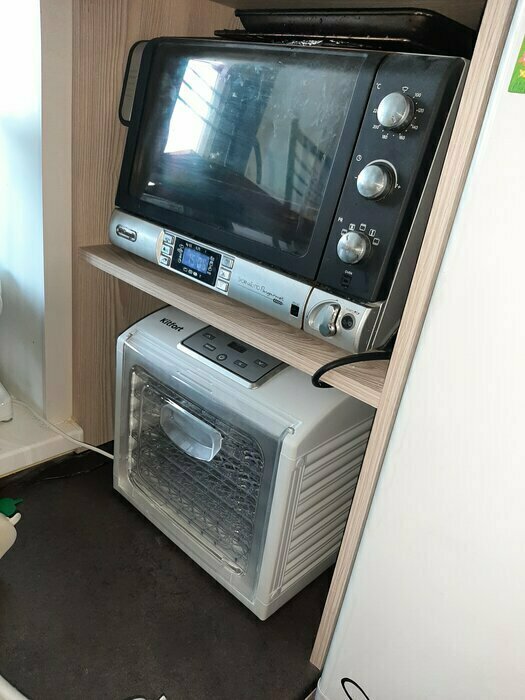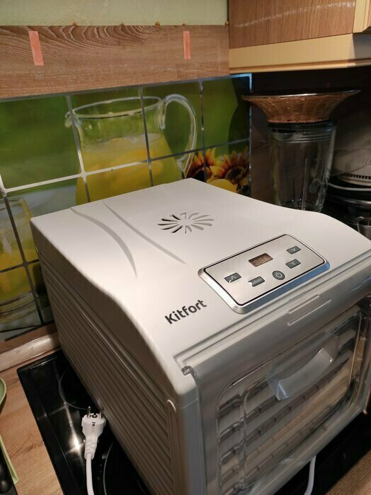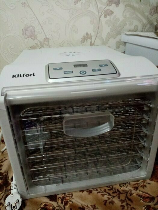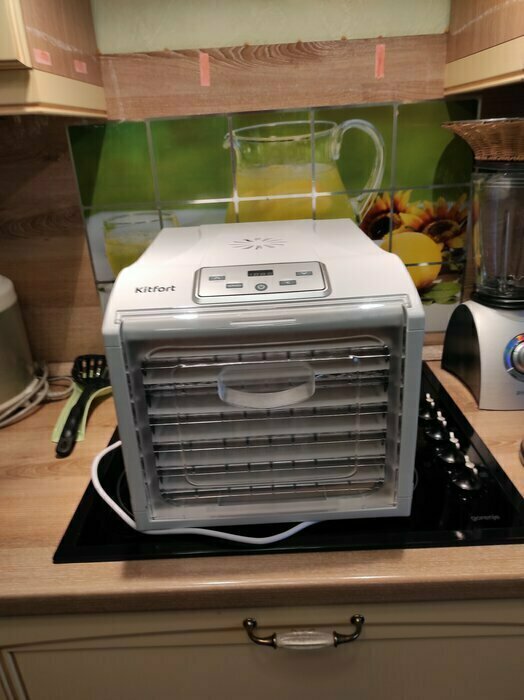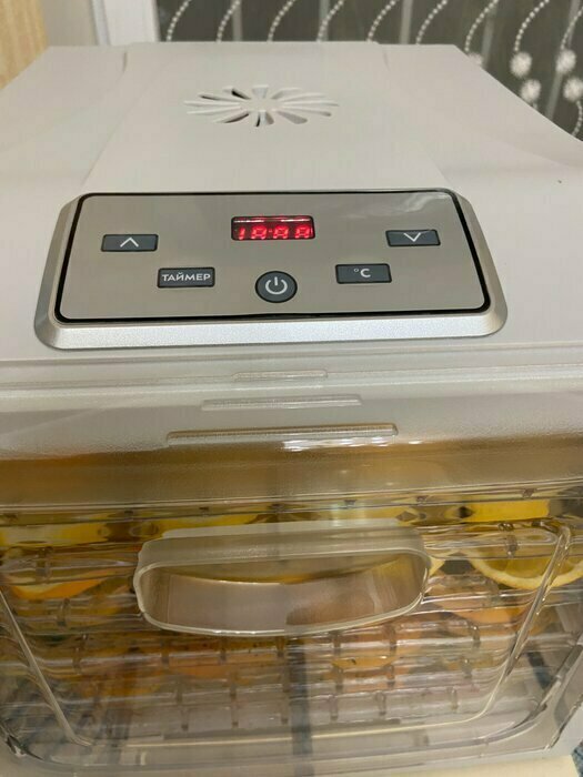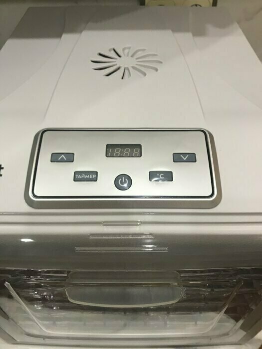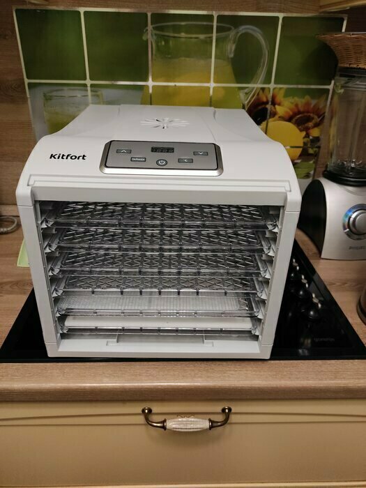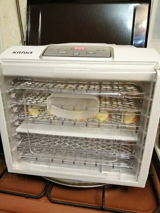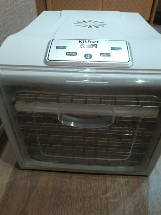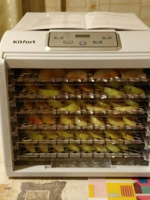 Не сложная в управление, меню простое с лёгкой навигацией. Клавиши легко нажимаются, не сенсорные, что для некоторых будет плюс. Не шумная, ставили сушить для пробы яблоки на ночь на 7 часов 55 градусов, отключилась под утро, никого не разбудила. Работает тоже тихо, тише чем микровалновка в разы, не мешает спать. Не тяжёлая, спокойной переносили, пока не нашли ей место. Жёсткая конструкция, не боишься сломать, некоторые в магазине ужеиперекошенные и не закрываются, особенно круглые, тут все хорошо - это очень радует. Крышка выдвигается вверх но плотно закрывает и не заедает/не перекашивпется. Можно встроить в гарнитур или разместить рядом с другими шкафами или холодильником, все кнопки и лотки находятся с перед, но сверху выход воздуха, лучше не закрывать отверстие. Поддоны пластиковые и легко устанавливаются, высота между поддонами 3см и не регулируются по высоте, нужно ставить все для лучшей церкуляции даже если они пустые. В инструкции написано что около двери сушит медленнее и надо переворачивать поддон по среди сушения, но мы ничего не поворачивали, все равномерно просушилось. Минус: Лотки для сбора жидкости меньше ширины стенок сушилки и их кладут на поддон, было бы удобней их ставить самих в пазы, но сдругой стороны, от сочных продуктов сок и жижа, сбегающая в них, тогда бы разливалась при их внимании. Так что может просто не привычно пока. Вывод: Мне понравилась. Не все рецепты опробывала, но то что делала было вкусно, быстро и удобно. Сушилка первая. Но из тех что встречались в магазинах, по объёму и крепости эта лучшая! Входит 12 литровое ведро яблок. По объёму и надёжности конструкции своих денег стоит, но по качеству сушки и долговесности пока судить рано, ещё впереди сушение мяса и грибов. Но на первый взгляд оптимальная в цене, чуть дороже обычных и существенно дешевле продвинутых.