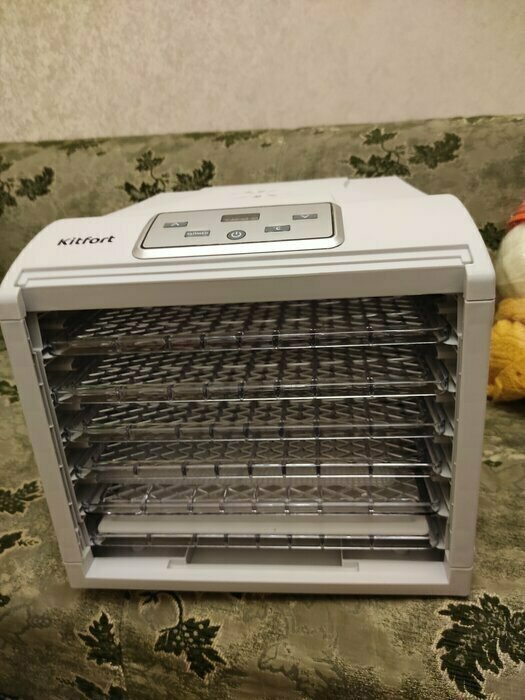 цвет на самом деле немного серый, но на мой взгляд даже так лучше, кто то в отзывах пишет что решетки и поддоны хлипкие, мне так не показалось, отлично что можно выставить любую температуру, и если поставить сушить пастилу и сухофрукты, что в любой момент можно с легкостью убрать любой противень. вообщем покупкой очень довольна, рекомендую