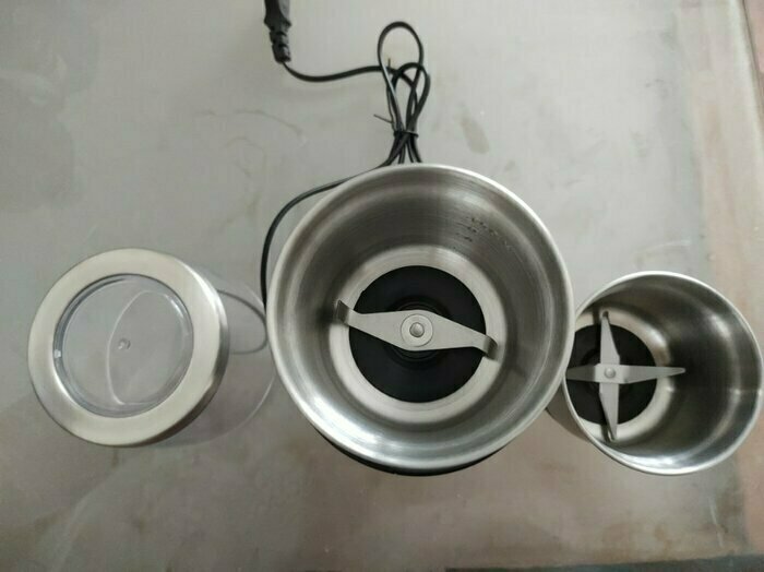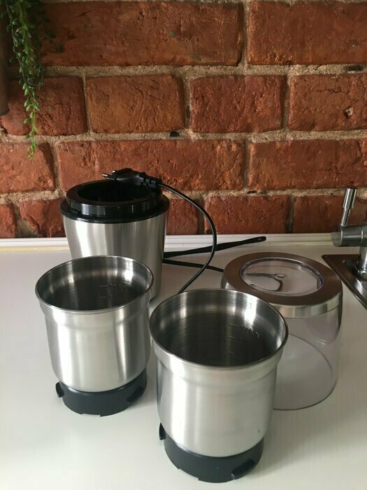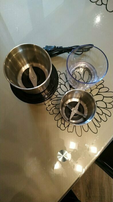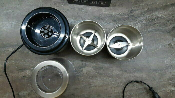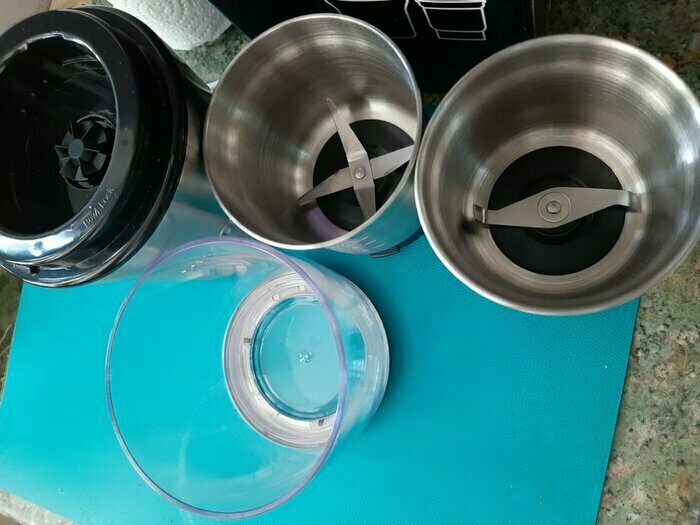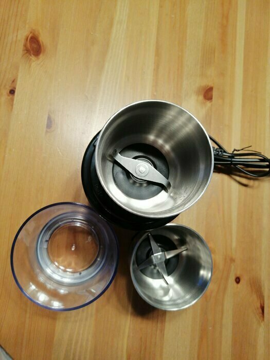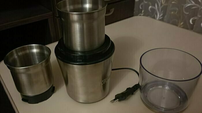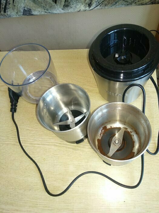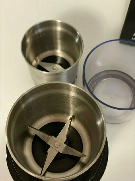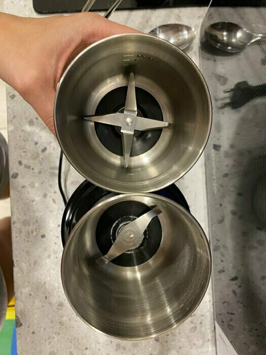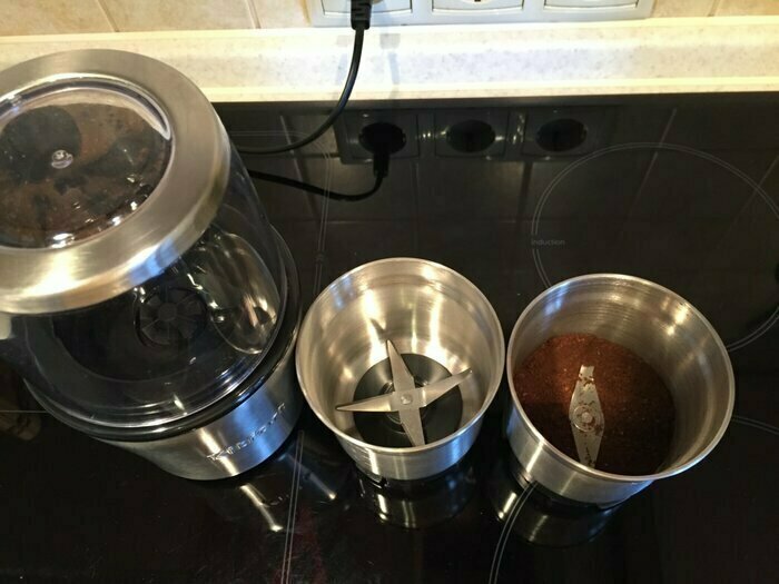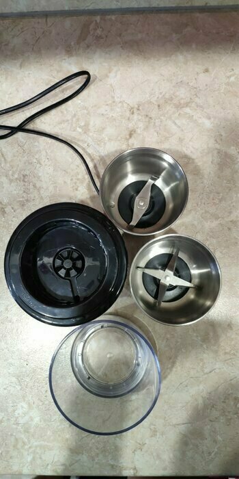 2 Вместительные чаши под кофе и специи, что необходимо человеку, который измельчает не только кофе!Приятная цена. Достаточно мощная. Уже протестировали на кофе, специях, орехах все молит на ура! Удобно мыть, ножи снимаются, потому что обычно под ними застревают частички продуктов, тут же такого нет