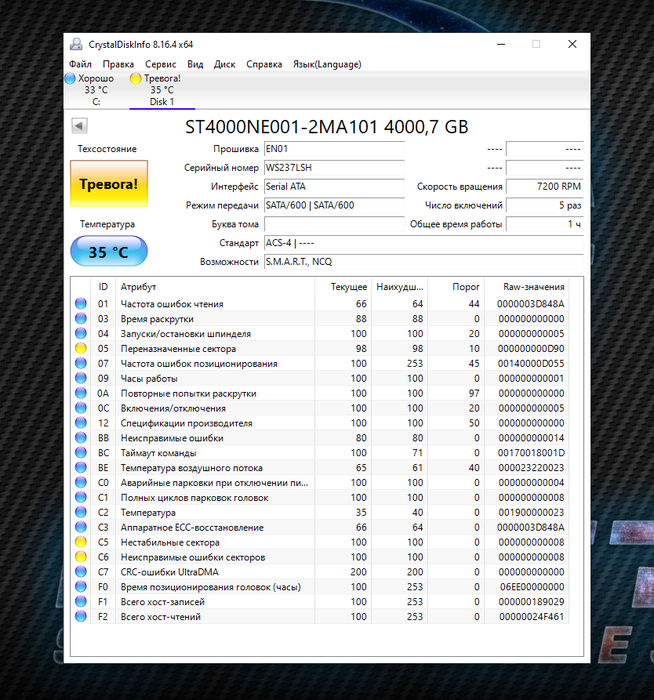 Диск новый. К сожалению, не успел проверить на работоспособность до истечения срока в 14 дней. Проверил сейчас. Диск щелкает, неприятно скрежечет. Винда его не хочет нормально форматировать и размечать новую область. Обратился в поддержку. Прислали целую инструкция, что надо колдовать. Потом им отправить.