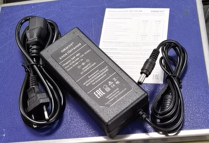 блок питания с внешним кабелем, напряжение на выходе: 48В, общая выходная мощность 96Вт, ток нагрузки (для БП): 2А, количество каналов: 1