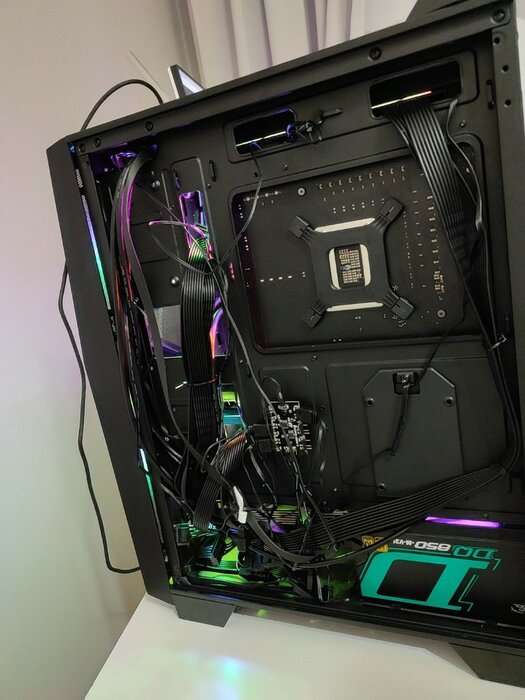маловато места для кабелей между материнкой и боковой стенкой. из-за этого с кабель-менеджментом не очень красиво выходит. но за металлической крышкой этого не видно ))