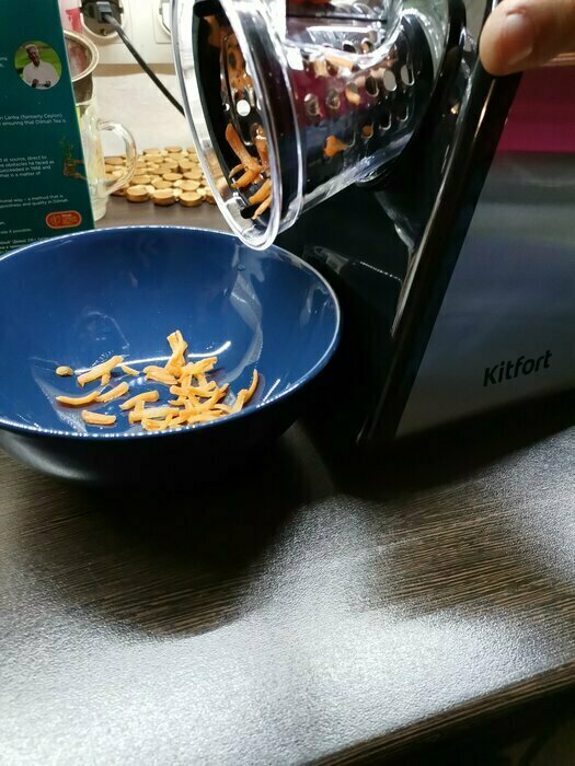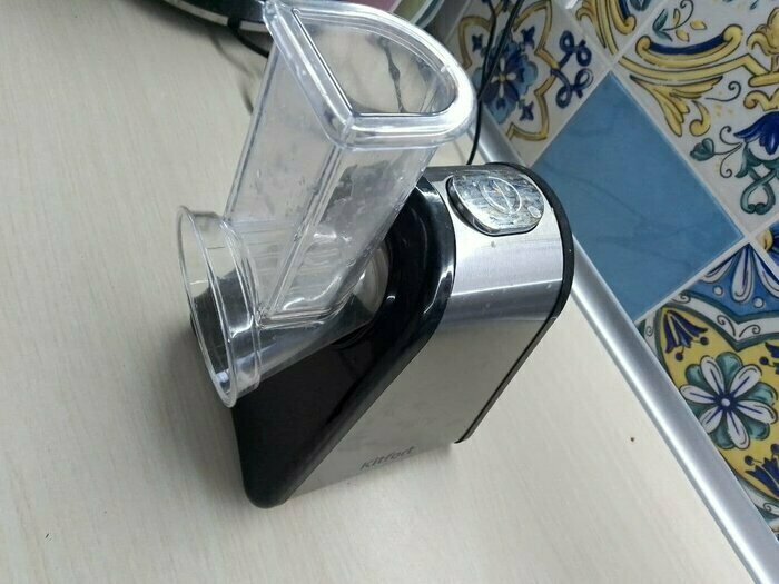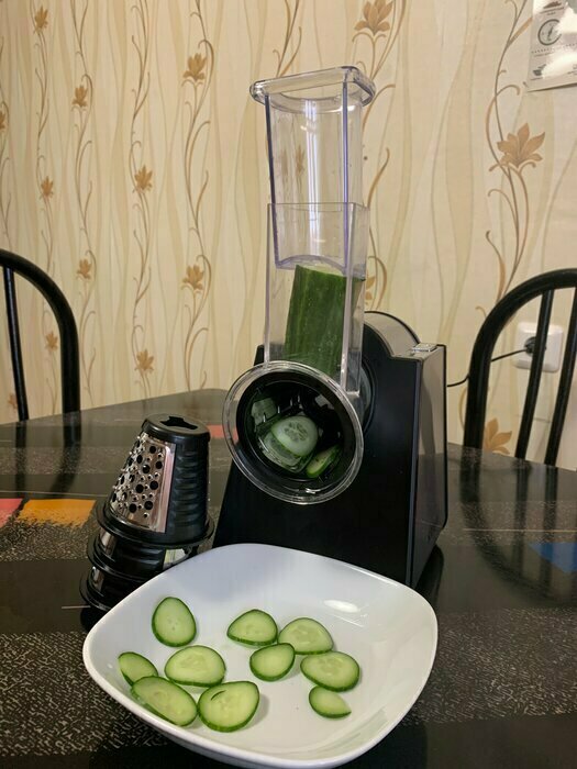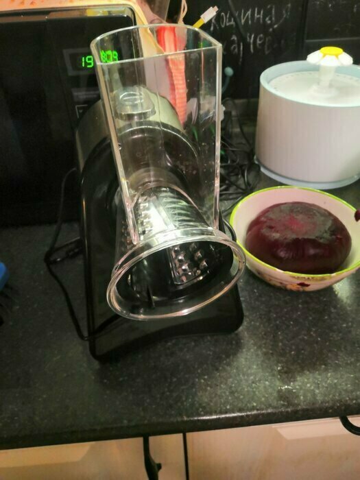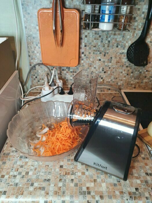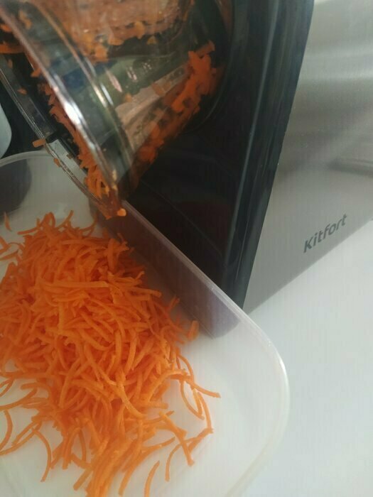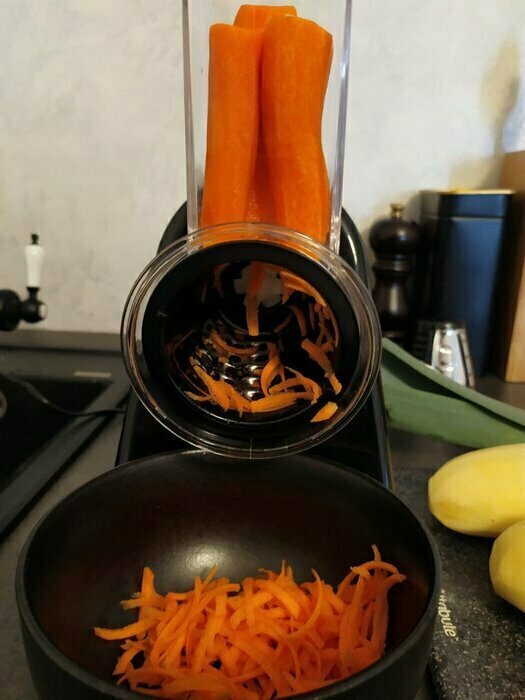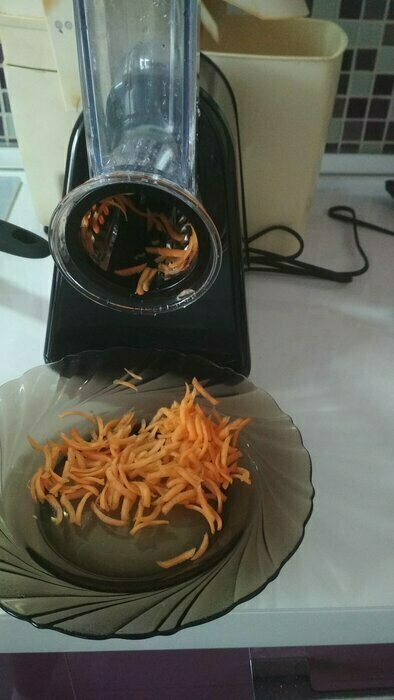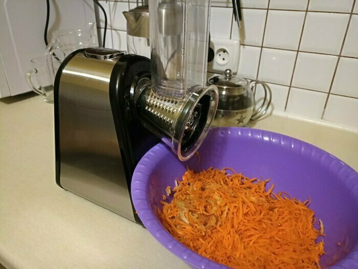 Моя первая электотерка, морковь трёт, правда очень медленно, нужно прилагать неплохие усилия. очень быстро забивается. Пробовала трать огурец слайсами, в целом не плохо. То,что нужно держать постоянно кнопку, совсем не удобно. Очищается быстро. После моркови пластик окрасился.