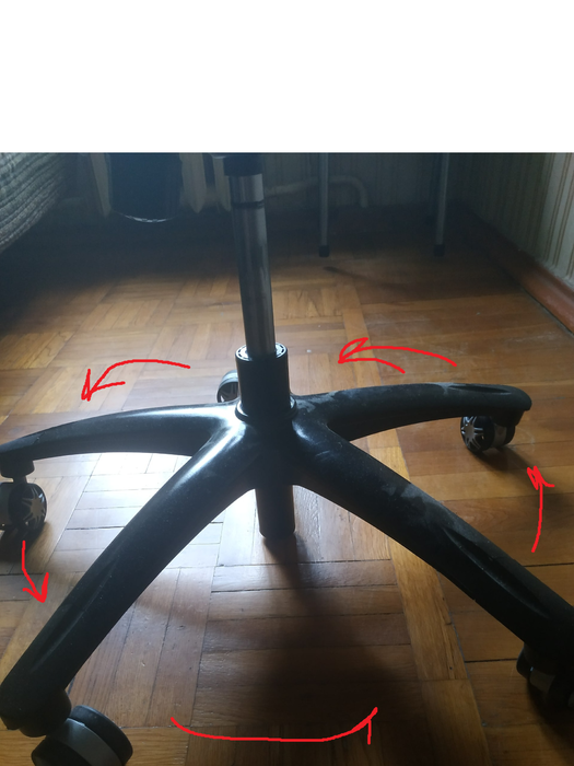 Через несколько месяцев слегка провалилась спинка (но это не критично для меня, сидеть всё равно удобно, сидушка не провалилась). Огромный недостаток этого кресла - это его крестовина. При весе в 95кг (максимально заявленный вес производителем - 120кг) она сломалась спустя 3-4 месяца использования (на кресле я не прыгал). Также была проблема с газлифтом, он ушёл вниз и кресло стояло на нём (исправили по гарантийному ремонту). На скриншоте (с красными стрелочками) я указал, что происходит, когда вы садитесь в кресло, каждое колесо уходит в бок.