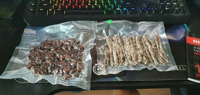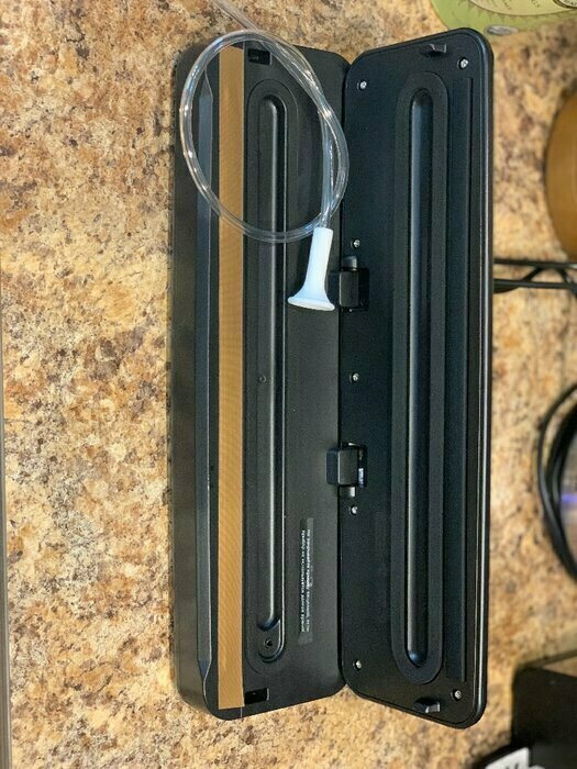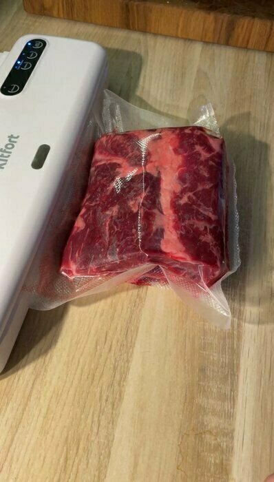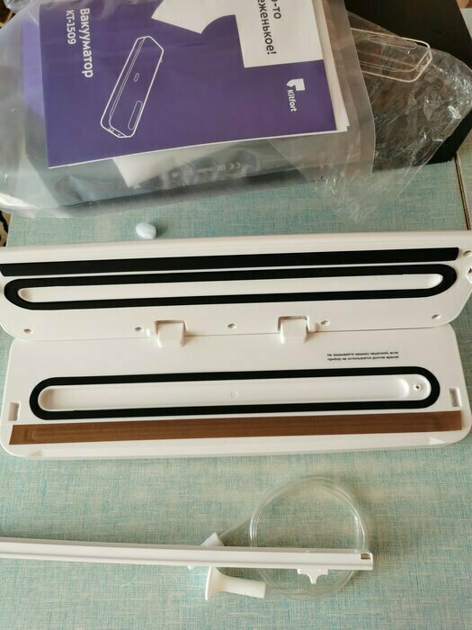 В комплекте также есть планка для отрезки пакетов, что очень удобно, так как заказали ещё следом целый рулон пакетов. Сам ваакуматор понравился, есть авто режим, где ваакуматор сразу и откачает воздух и спаяет. А есть ручной режим, где можете откачать воздуха столько, сколько нужно (это функция прямо порадовала). Покупала для хранения мяса и готовки в сувиде. Также в комплекте есть небольшой шланг, если вы собираетесь ваакумировать не в пакете, а например в контейнере.