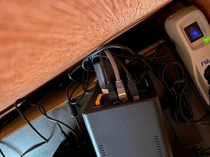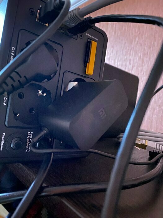 Короткий несъёмный шнур, всего 1,2 м. Мне не хватило всего 5 см. чтобы поставить его где планировал. Розетки сзади очень близко, но это видно и на фото. Блоки питания могут мешать соседним розеткам. Достаточно сильно греется даже без особой нагрузки. Температура боковой стенки корпуса сзади доходит до 47 градусов. В передней части ниже, но батарея внутри далеко не в самых лучших условиях находится и вряд-ли проживет долго, но на заявленные 3 года должно хватить. Яркая не отключаемая подсветка - это минус, если он стоит в спальне. Запах присутствует.