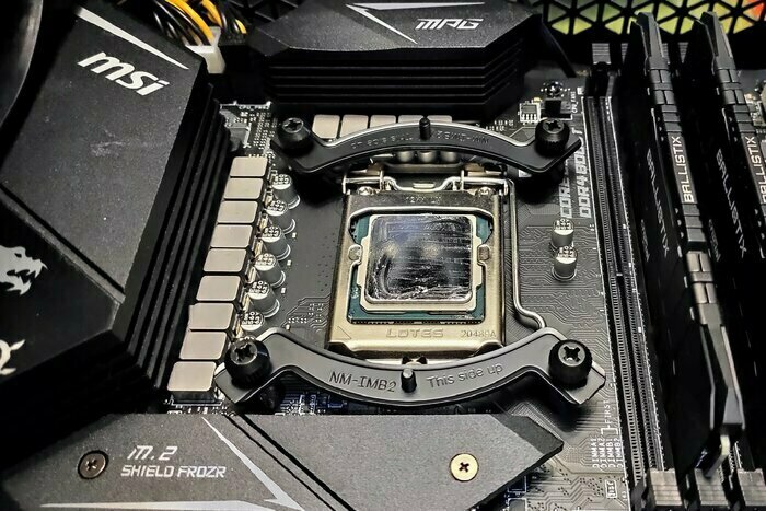 Плата MSI MPG Z490m GAMING EDGE WIFI, NH-15S, 10600KF, жидкий металл. Разгон на постоянку 52-52-52-53-53-52 при 1,440v. Температуры в стресс-тестах до 79-86грд.