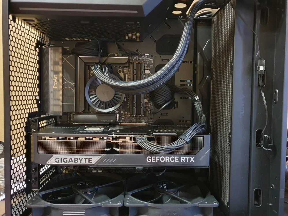 Хорошие корпусные пропеллеры. Мощный обдув видеокарты снизу. Быстросъёмные пылевые фильтры. Стальные стенки, которые не треснут от случайного удара в борт. Только один светодиод во всём корпусе, в кнопке включения. Широкий, что даёт пространство для установки крупных видеокарт и не мешает проводам питания карты. Провод питания воткнутый в карту 5090 не сильно изгибается, что хорошо скажется на нагреве коннектора + обдув корпусными вентиляторами.