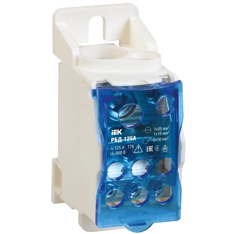 блок распределительный на DIN-рейку/монтажную панель, защита IP20, сечение подкл. проводников на входе: 1х35, 1х16 кв.мм, номинальное напряжение: 660 В, номинальный ток: 125 А