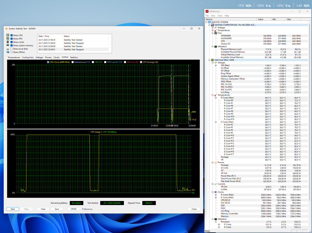 На эту мать был установлен камень Intel Core Ultra 265K (OEM-ный). С момента установки прошло несколько дней и пока ни единого намека на траблы (опыт - наше всё и через мои руки прошло много железа и пока ни единого намека на возможные проблемы я не увидел). Никаких настроек в BIOS пока не делал. На этой сборке у меня установлены две "оси": Windows 11 Pro и Ubuntu Linux 24.04.3 LTS. Ни единого бага, всё стабильно. Температура камня под воздушкой Noctua NH-D15 в idle mode 39 градусов (под Linux тот же расклад). Под нагрузкой - температура поднимается до 85 градусов (CPU Package, по-старому TDP, фиксируется на уровне 165W). Одну звезду снимаю за то, что мать поведённая.