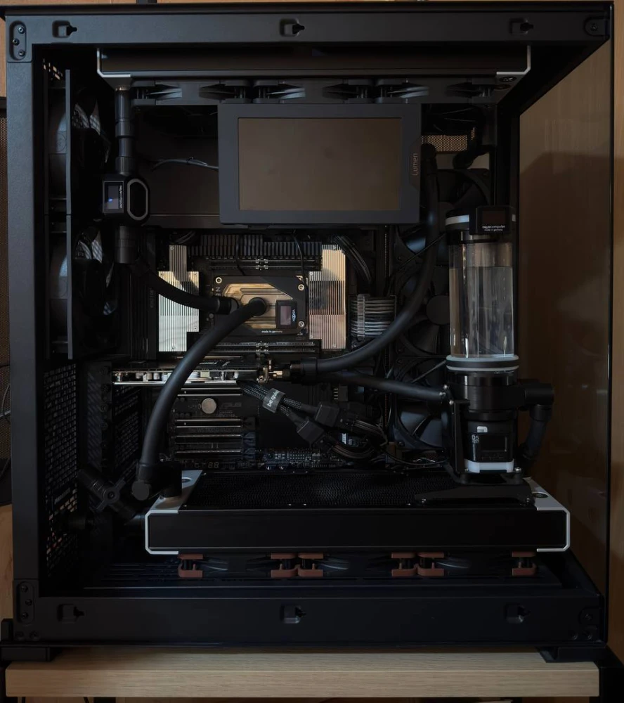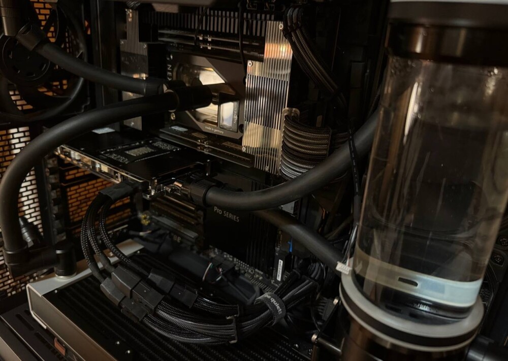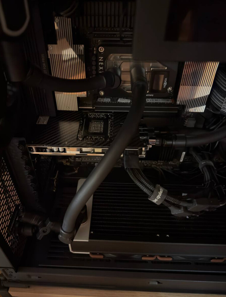 Порты подключения очень узко посажены. Из-за этого два фитинга от EKWB не вместились. Более того даже два фитинга от Alphacool не смоги встать друг с другом. Пришлось поставить сначала два поворотных адаптера Alphacool Eiszapfen 16mm (адаптер 8mm тоже подойдет) и только потом вкрутить фитинги. Водоблок сильно порезал скорость потока, возможно имеет смысл ставить в отдельный контур.